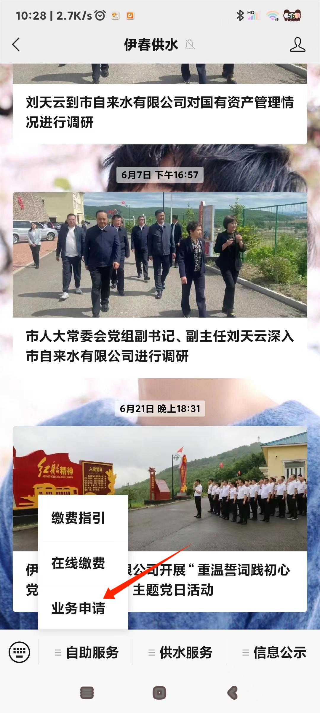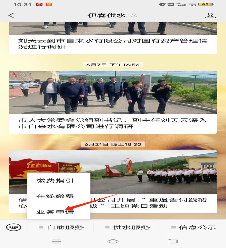4、进入伊春供水后,点击自助服务--业务申请