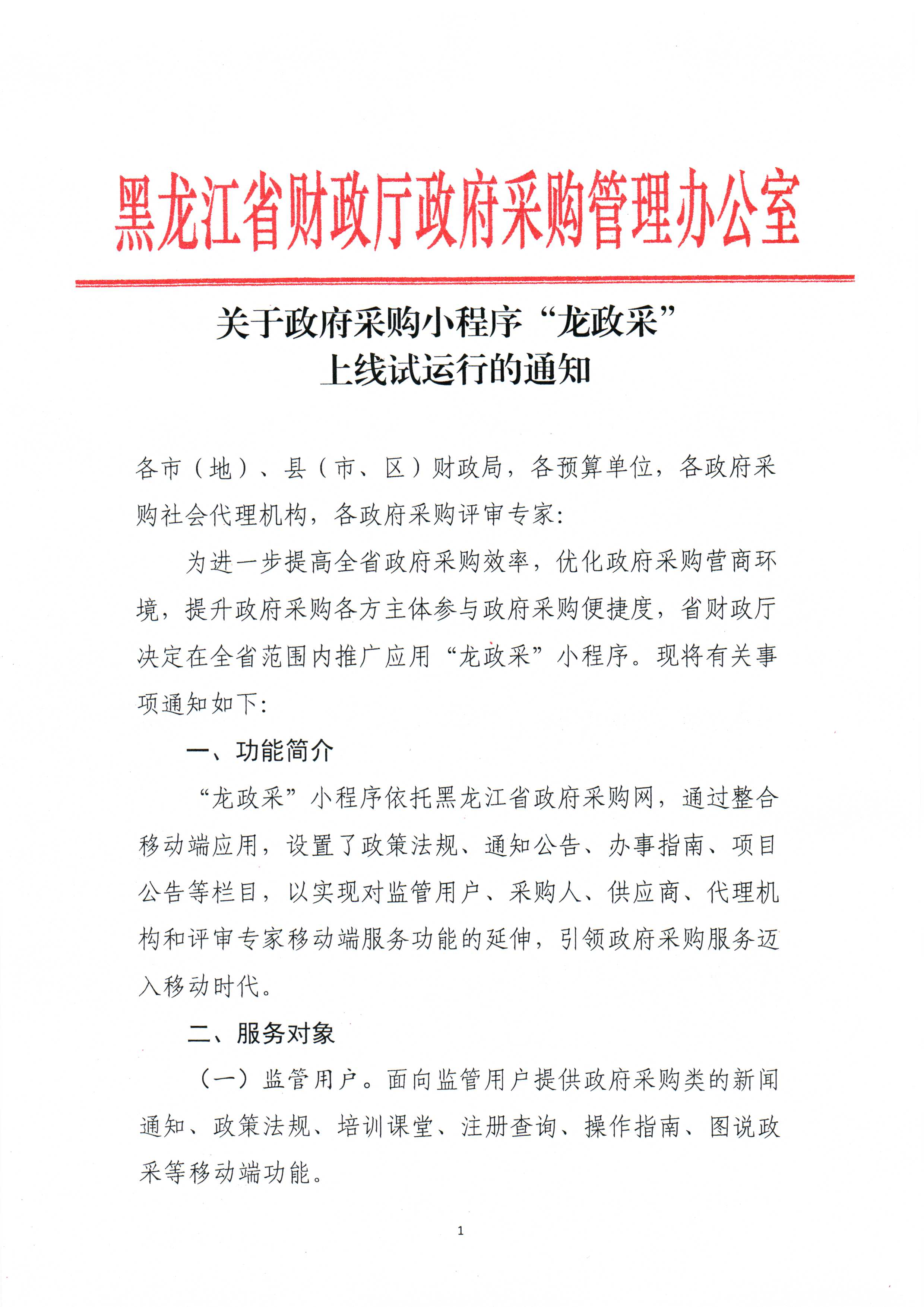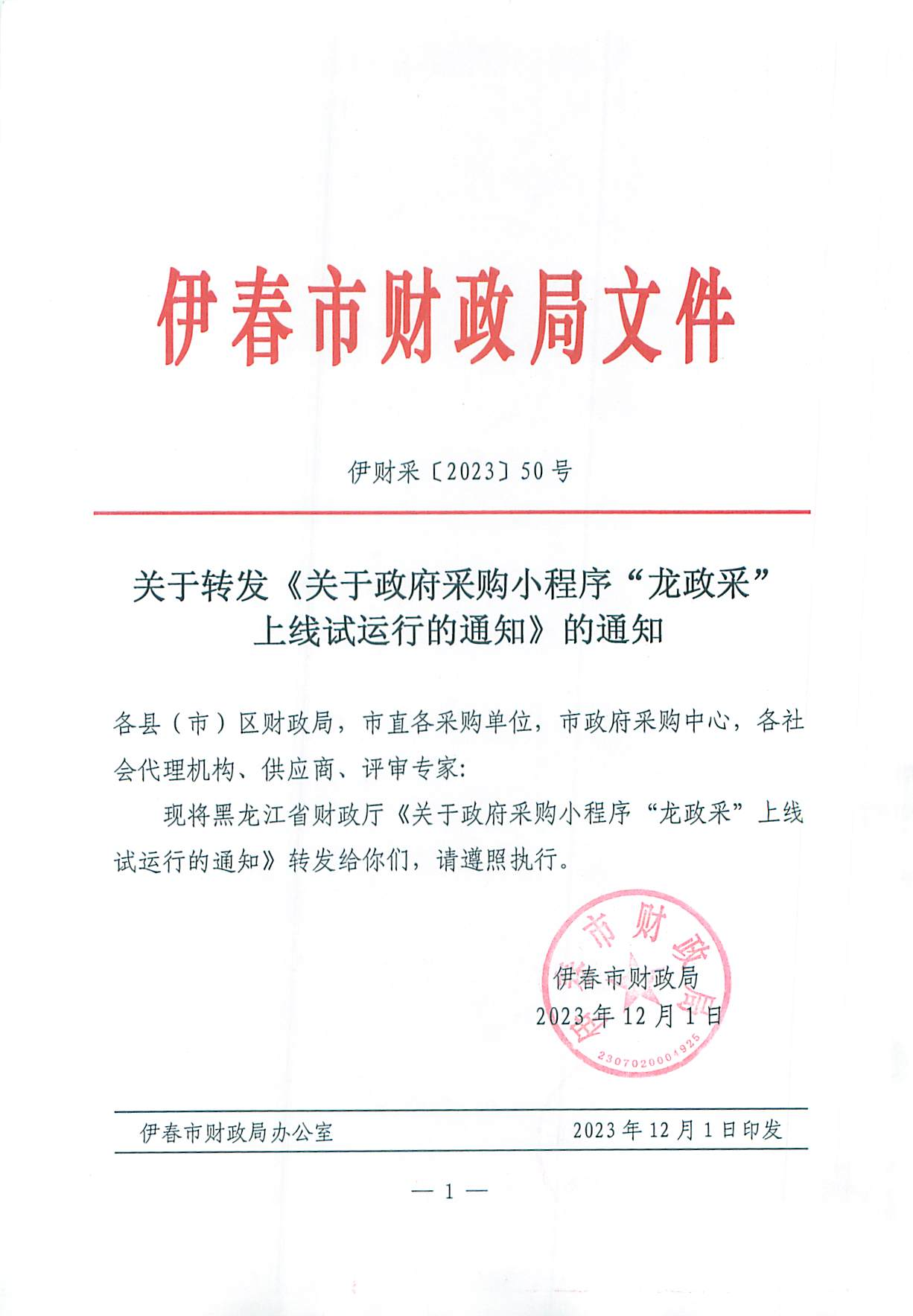 关于转发《关于政府采购小程序“龙政采”上线试运行的通知》的通知(伊财采〔2023〕50号)